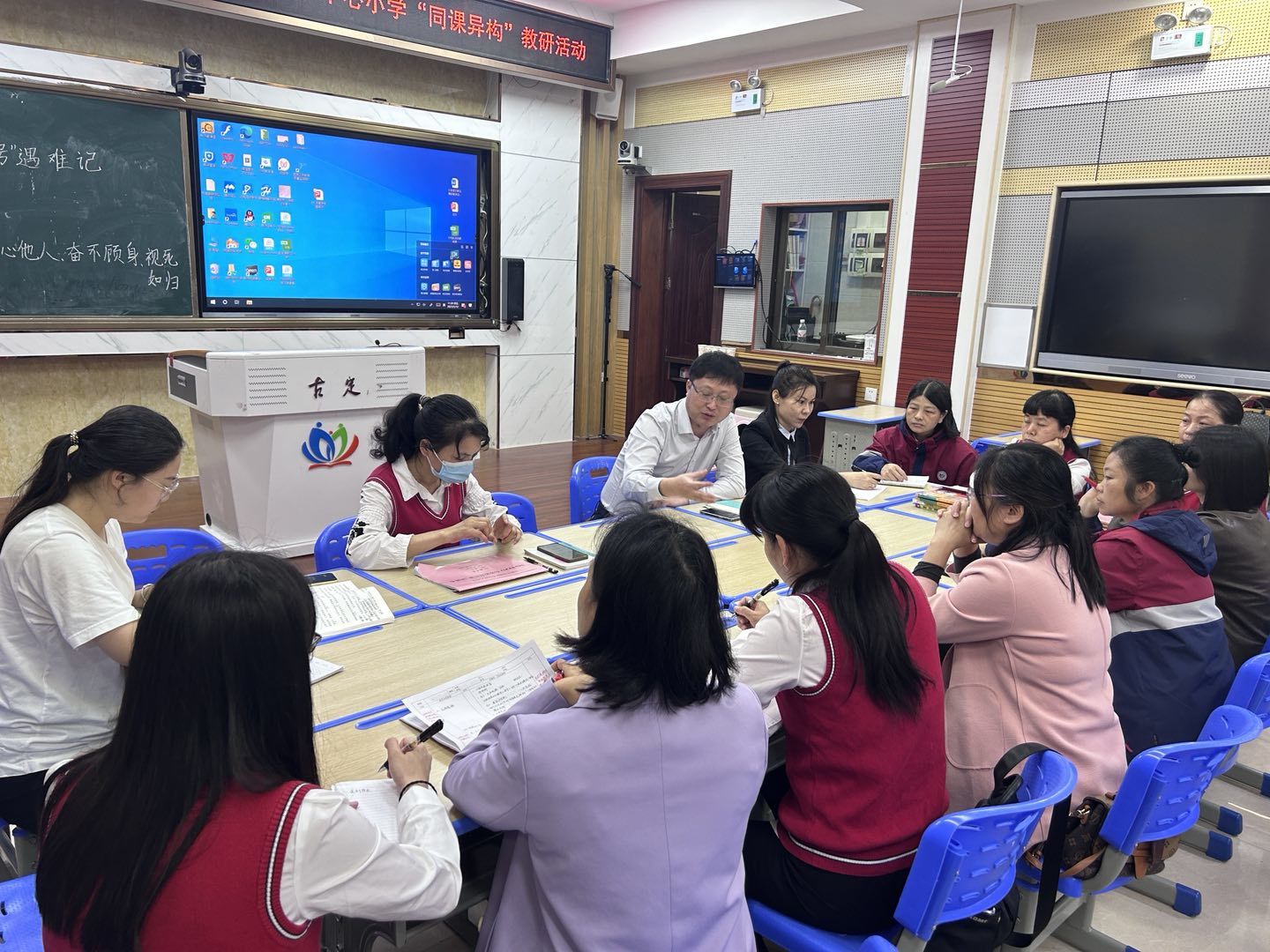 讲座结束后,卓越教师班学生席佳瑶、周珊求、马逢丽和林春珍分别与古定中心小学教师陈丹、王清丽和梁可谊开展语文、英语和数学的同课异构。语文、英语和数学同课异构的主题分别是:《“诺曼底号”遇难记》、闽教版三年级下册《Unit8Children's Day Part A》、《年月日》。课后各学科组内教师都对授课教师表示高度赞赏,在鼓励的同时不忘对她们教学时细节把控提出中肯的建议。