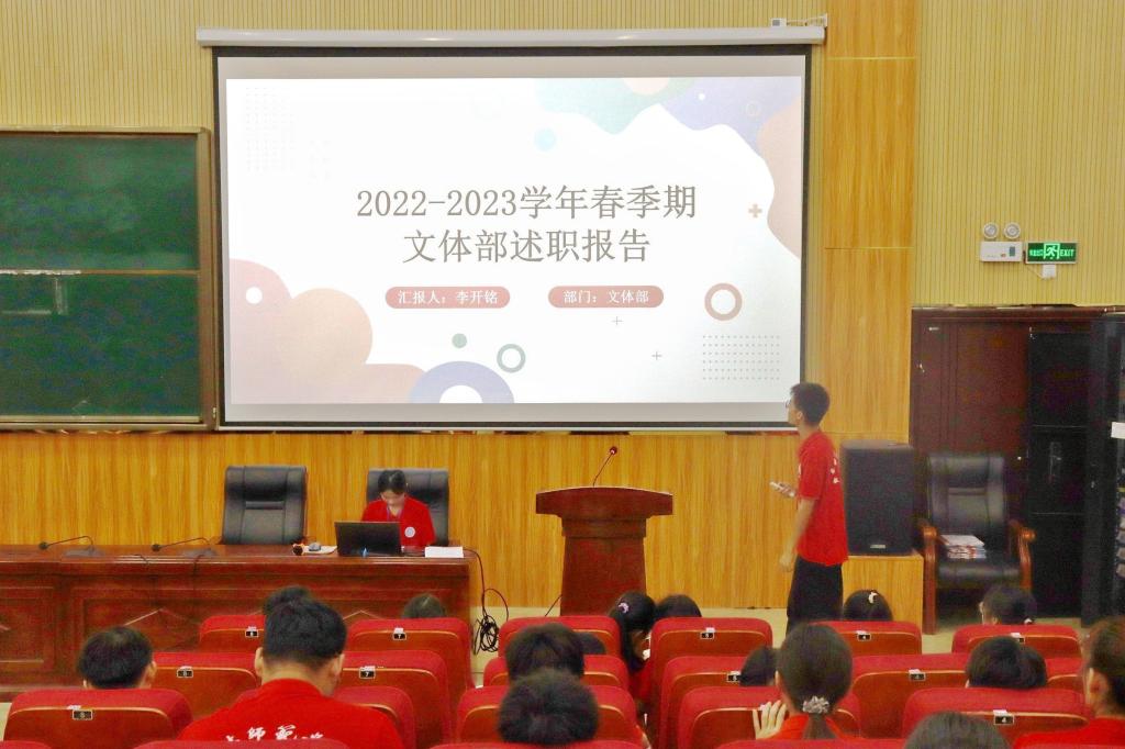 为推动我院各项工作顺利开展,6月17日,我院于东校区明德楼113会议室召开2022-2023学年春季期团委学生会述职大会,我院党委副书记李尚芳,团委书记李欣怡,辅导员李泽荣,兼职辅导员田欢妤,全体团委学生会干部及班委代表参会,文体部负责人陈帆担任主持。