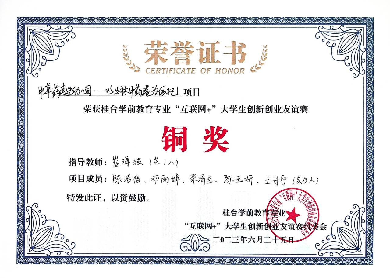 为学习贯彻党的二十大精神和习近平总书记关于对台工作的重要论述,不断巩固桂台教育交流合作常态化长效机制,深化桂台学前教育专业人才培养的交流与合作,提升两岸大学生创新创业能力,促进两岸大学生相互了解、增进友谊,自治区教育厅举办桂台学前教育专业“互联网+”大学生创新创业友谊赛。本次比赛由学院党委书记崔海波书记指导的《中草药走进幼儿园——以玉林中药港为依托》项目团队、由李春霞老师指导的《传统农具科学智慧融入幼儿园科学教育实践探索》项目团队荣获两项铜奖。