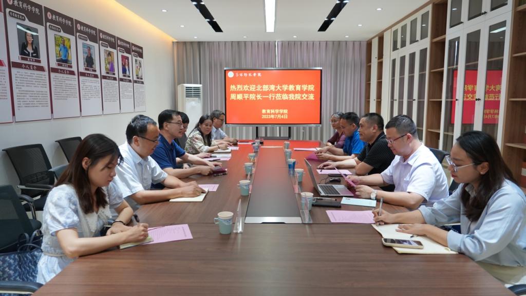 7月4日下午,北部湾大学教育学院院长周顺平一行莅临我院交流,我院领导班子成员,北部湾大学教育学院院长周顺平、副院长尹珂,以及两院教师代表参加此次交流会。