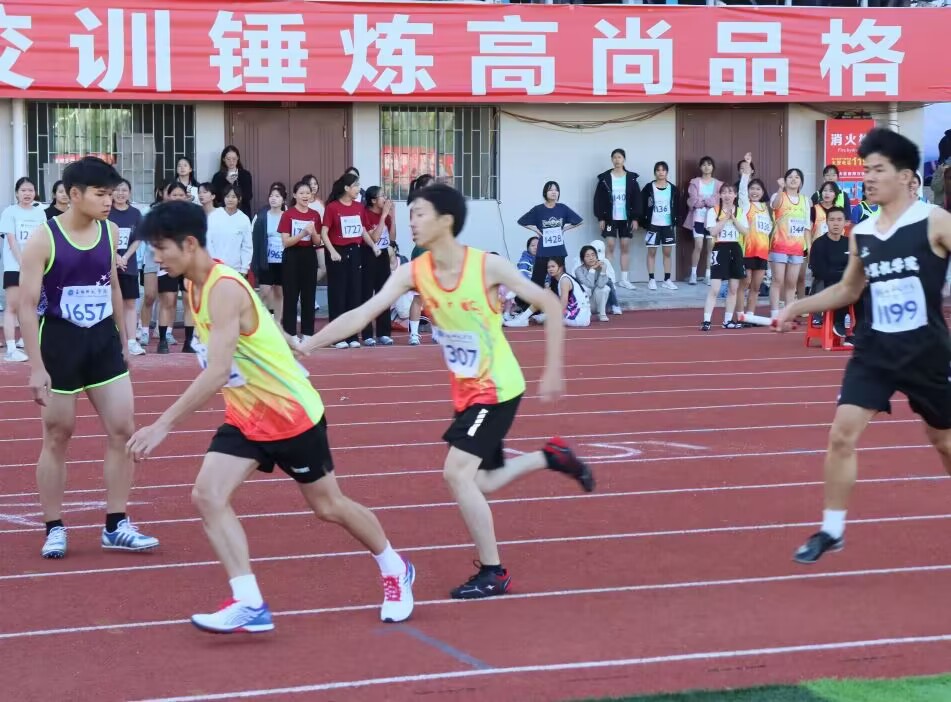 赛前,运动员信心十足,精神抖擞,积极进行踢腿、弓步走、原地小步跑等热身准备活动,以最佳的精神状态迎接比赛。随着裁判员一声身令下,我院运动员代表李宗河冲出起跑线,势如破竹,用尽全力向前奔跑,并以最快的速度将接力棒传递给第二棒李华林,紧随其后的李愈亮接过棒用更快的速度向前冲去。其他选手不甘示弱,奋起直追,拼尽全力将彼此间的距离缩小,接力棒中凝聚着运动员训练的结晶,展现出彼此的默契。现场氛围高涨,观众喝彩声、欢呼声不断。