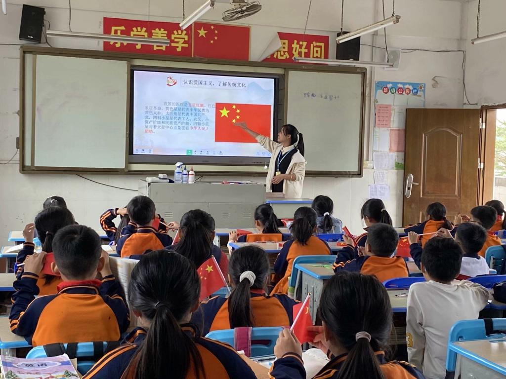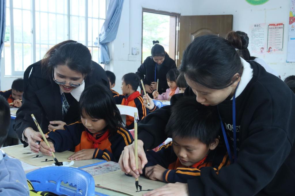活动开始前,子活动负责人何心绮、朱小玲、梁小珍、覃秋月组织团队成员分工合作,认真准备授课内容,积极沟通交流,提前准备活动道具。随后,子活动负责人分别在各个班级开展“墨润童心·文韵悠扬”书法学习课堂、“非遗缠花进校园,春仔遗产润童心”缠花学习、“花季初启蒙,我们在行动”性教育普及、爱国主义教育学习活动。活动过程中,团队成员充分利用自身专业知识,为孩子们带来精彩活动课堂。在书法课堂上,团队成员向孩子们介绍书法基本知识与技巧、规范使用毛笔方法、正确掌握笔画书写顺序,孩子们在书法练习中,感受中国汉字魅力;在非遗缠花课堂上,孩子们在团队成员指导下热情高涨,积极动手学习缠花制作,一朵朵风格独特的缠花在孩子们手上慢慢“绽放”,让其感受到浓浓的非遗文化魅力;在性教育普及课上,团队成员借助游戏与问题抢答形式,由浅入深向孩子们普及相关性教育知识,引导孩子们正确认识性侵害,建立正确价值观,学会保护自己;在爱国主义教育课堂上,团队成员带领孩子们切身感受中国漫长而曲折发展史,培养其爱国情怀,扎根其心中爱国精神。
