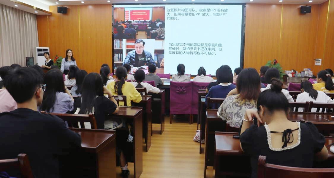 会上,樊华对开学以来各部门在学院新闻宣传工作付出努力给予肯定与赞许。并围绕近期稿件和摄影中存在的问题和改进提出意见,她指出,新闻撰稿时要注意在“关键信息”“慎用词汇”“校园新闻常见问题”上做到精准无误,并分享了选题技巧、摄影技能和编辑功能的经验做法,为大家进行了深入浅出的分析讲解。